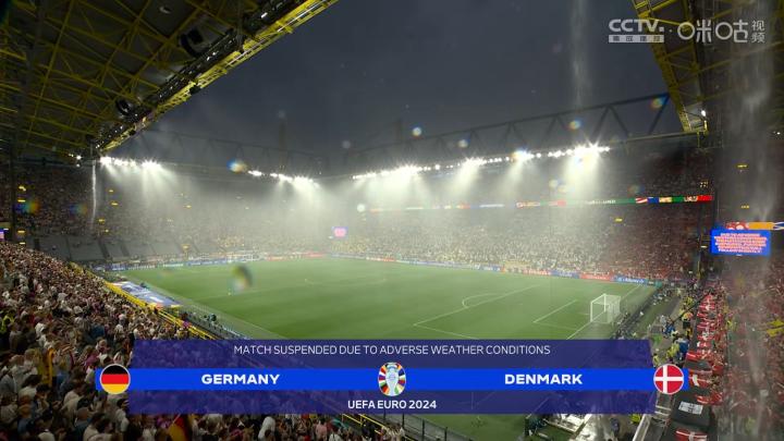 多特蒙德大雨倾盆,威斯特法伦球场顶棚开始漏水LacklusterNo @懂球帝2024-06-30 03:51北京时间6月30日凌晨,德国队在威斯特法伦球场对阵丹麦队。本场比赛第36分钟,比赛因极端天气暂停。根据直播信息,多特蒙德目前正电闪雷鸣,冰雹也伴随着雨滴从天空中不断落下。本场比赛场地威斯特法伦球场的顶棚也出现了漏水的情况。目前,尚不清楚本场比赛何时能够恢复。不过,客队丹麦球迷反而在大雨中整起了活儿,他们借助漏雨的顶棚开始“冲澡”。展开更多