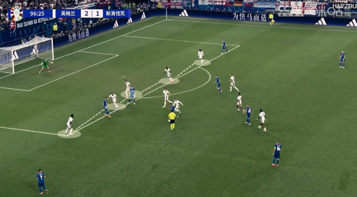不同于小组赛阶段的疯狂前压,斯洛伐克此役表现地非常克制,他们重兵布防中场,切断英格兰的地面推进通道。拿下球权后,斯洛伐克的进攻毫不拖泥带水,如果不能从边路完成提速,就用长传打击+争夺第二落点的方式冲击三狮防线。英格兰控球时拉开空间,特里皮尔和萨卡贴近边线站位,中圈弧附近的大片区域是斯洛伐克的重兵集团,斯通斯和格伊争顶时非常吃力(没有马奎尔的弊端),队友也拿不到第二落点。