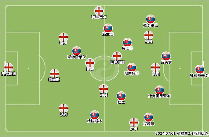 斯洛伐克的锋线攻击手大多只能在小联赛中立足,中后场有多名实力派球员坐镇。卡尔佐纳的战术是由三名中场驱动压迫和逼抢,洛博特卡掌控全局,杜达和库茨卡在对手防线的缝隙中寻觅战机。在他们的身后,苏斯洛夫和拜奈什皆具有微波炉属性,斯洛伐克中场的能量可以持续燃烧90分钟。索斯盖特显然不想重蹈比利时的覆辙,他的策略是依靠梅努用控球消耗对手,比分领先后再换上加拉格尔保住胜局。