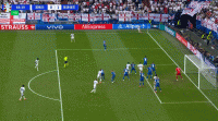 (图)斯洛伐克球员跑动积极,中圈弧附近人数优势明显。斯通斯和格伊控制不了第一落点,队友们也拿不下第二落点,斯洛伐克的快攻总能迅速发展到皮克福德身前。