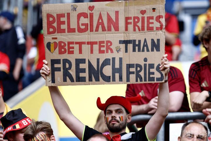 在今天凌晨进行的欧洲杯八分之一决赛中,比利时对阵法国,其中有比利时球迷举起了“比利时薯条比法式薯条好吃”的牌子。