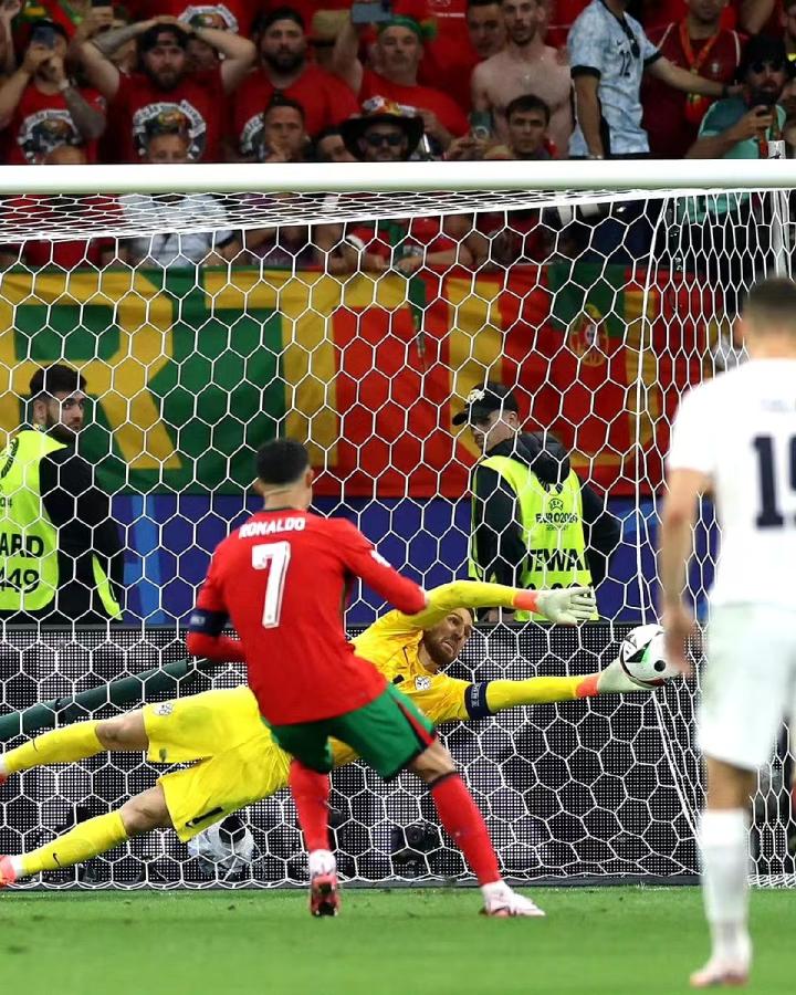 全场比赛,葡萄牙有多达20脚射门。皮球在斯洛文尼亚门前高高低低地轰击过来,却都过不了奥布拉克。双方在常规时间0-0打平,加时赛C罗的点球被奥布拉克神勇扑出。双方进入点球大战后,斯洛文尼亚的三粒点球都被迪奥戈-科斯塔扑出,葡萄牙则三罚三中,有惊无险地进入八强。