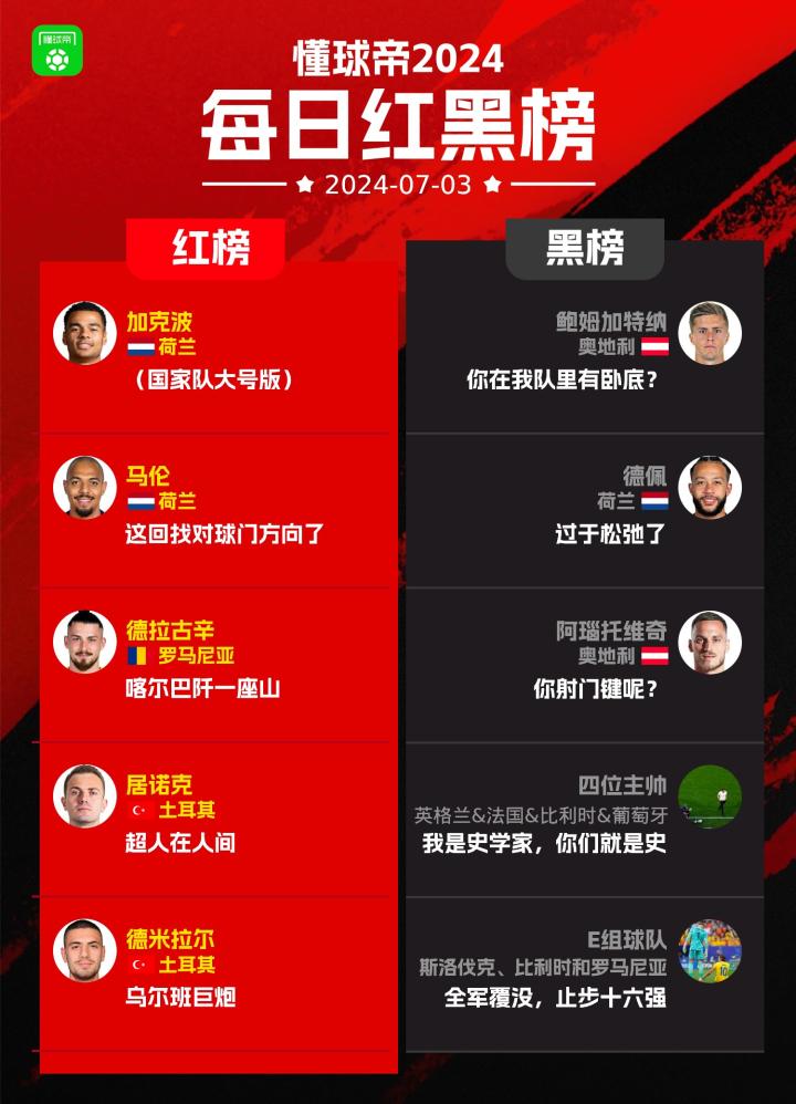 懂球帝每日红黑榜:两大中卫领衔红榜,四位教头速来挨批我上榜啦 @懂球帝2024-07-03 08:00大家早安,懂球帝红黑榜继续与你相约早八!红榜群星闪耀,传射建功的加克波、梅开二度的马伦与德米拉尔齐入选。黑榜这边,比起奥地利的两大“卧底”,E组全部出局的倒霉蛋以及此前比赛中场面催眠的四大豪门主帅,似乎才是槽点所在。展开更多
