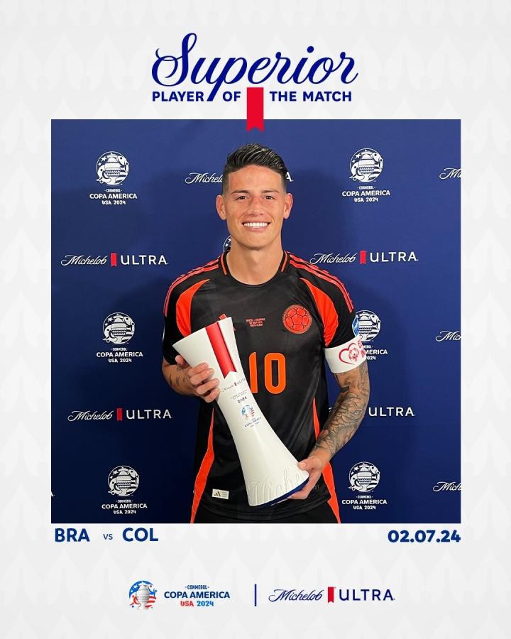 美洲杯小组赛第3轮巴西1-1战平哥伦比亚后,哥伦比亚球星J罗被评选为本场比赛最佳球员。