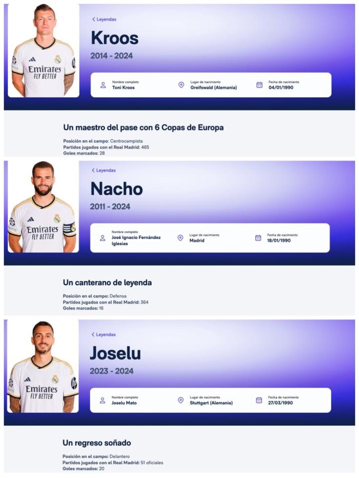 在皇马官网的“历史上的皇马球员”(Jugadores del Real Madrid)栏目中,按球员名字的首字母依次列出所有为皇马一线队效力过但已离开俱乐部的球员,在球员的个人页面,还可以查看其出场次数、荣誉等基本信息和皇马官方对球员的评价,如称克罗斯为“一位拥有六座欧冠的传球大师”,纳乔则为“青训传奇”,何塞卢为“梦幻般的回归”。