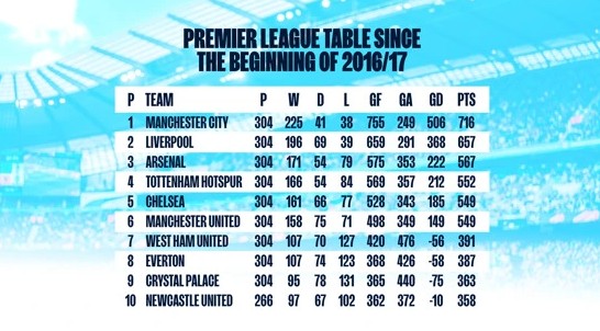 曼城在这八个赛季的304场比赛中获得了716分,同期比排名第二的利物浦多出59分。