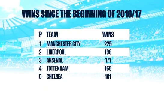 在瓜迪奥拉的带领下,曼城在304场英超联赛中取得了225场胜利,比其他任何球队在同期取得的胜利都至少多29场,球队的胜率为74%。