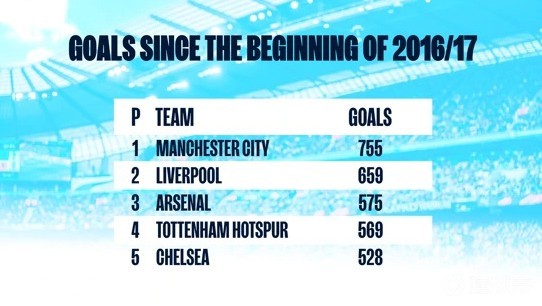 球队的进球数同期比利物浦的659球多出近100球,而阿森纳、热刺和切尔西是另外三支进球数超过500的球队。