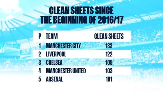 在瓜迪奥拉的带领下,曼城在304场联赛中保持了133场零封,平均每2.28场比赛就能零封一场。