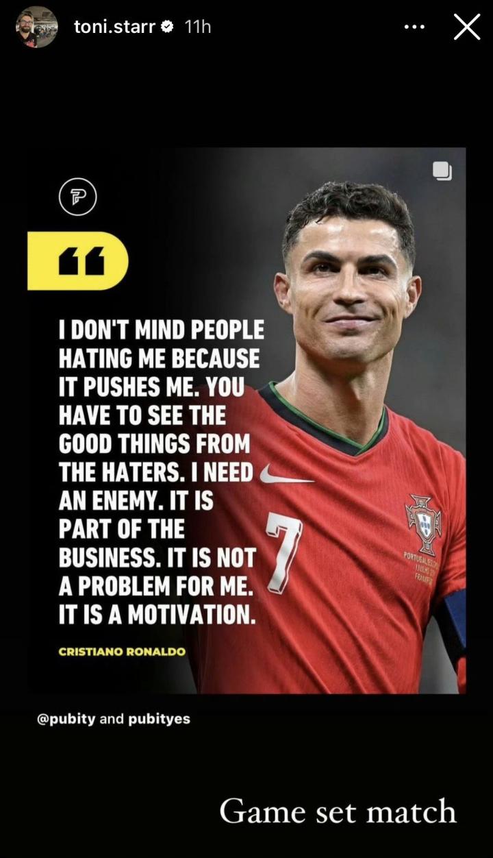 在这之前斯塔尔就曾在社媒表达过对C罗的喜爱,他曾发过C罗的照片并配文:“Game set Match。” (一个常用的网球术语,意为“比赛结束”,表示比赛已分出胜负,暗示C罗已经用行动证明了自己,赢得了胜利。)
