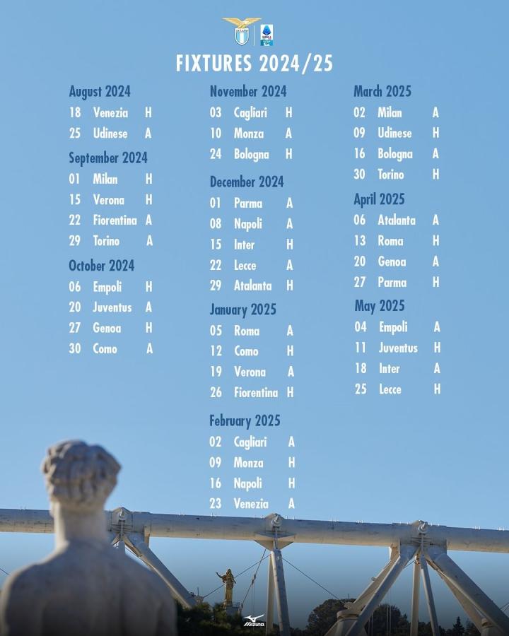 飞翔的蓝鹰意甲官方刚刚公布了24/25赛季全部赛程,首轮比赛在8月17日开始,最后一轮比赛则安排在在2025年5月25日。