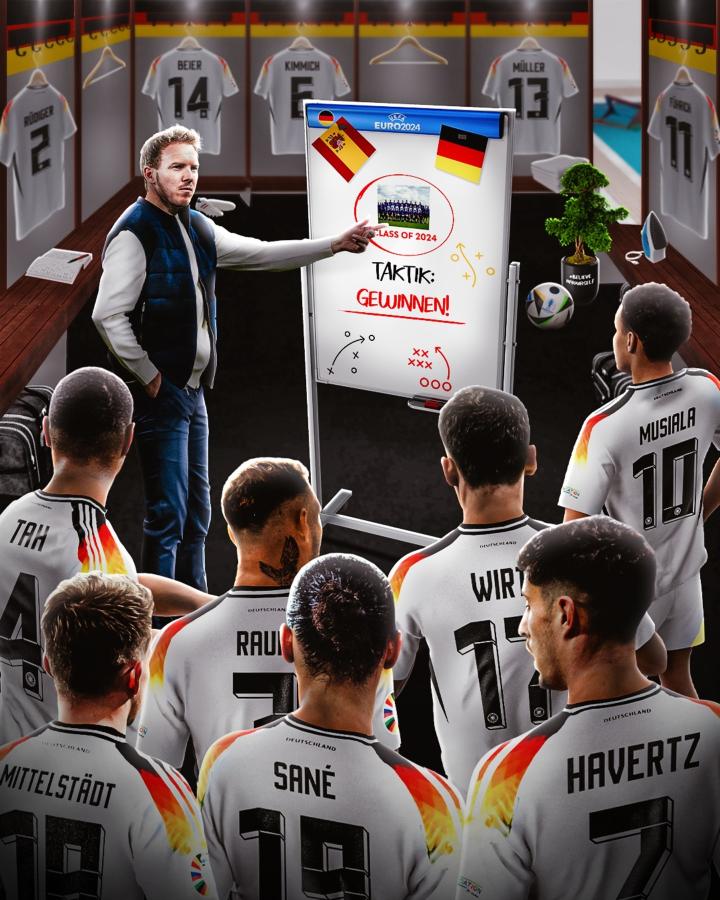 德国队晒预热海报:纳格尔斯曼更衣室演讲,争胜就是战术JayStones @懂球帝2024-07-05 14:48北京时间明天凌晨0点,德国队将迎来欧洲杯四分之一决赛对阵西班牙的比赛,赛前,德国队官方发布了本场比赛的预热海报。海报当中,德国队的球员们聚集在更衣室里听纳格尔斯曼演讲,纳格尔斯曼身边的战术板上钉着德国队全员的合照,下面写着:“战术:赢!”出镜的球员有:约纳坦-塔、劳姆、维尔茨、穆西亚拉、米特尔施泰特、萨内和哈弗茨。展开更多