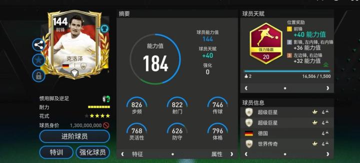 克洛泽是大器晚成的球星代表,他也是德国足坛最伟大的前锋。欧洲杯传奇克洛泽配备了强力锋霸天赋,提升了他的加速、射门、抢点、头球、力量五项数据。花式方面,克洛泽同样是四星的花式星级,基础花式为马赛回旋,这让他具备了稳定的前场持球进攻能力。