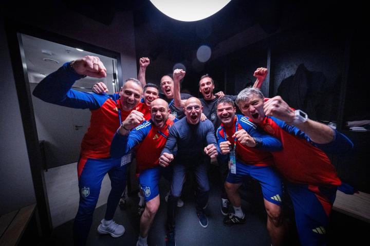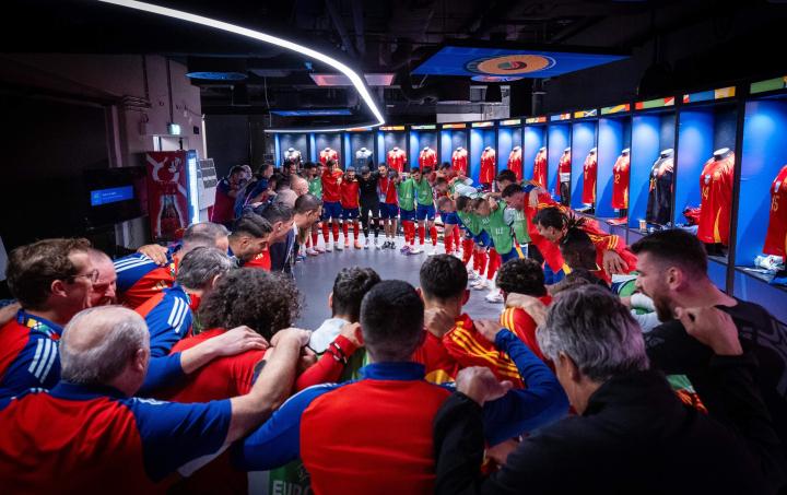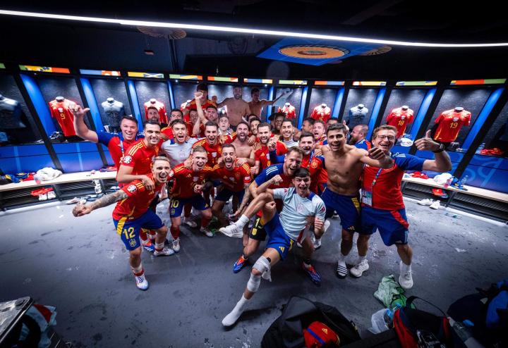 西班牙晒全队更衣室庆祝合照,佩德里膝盖缠着绷带