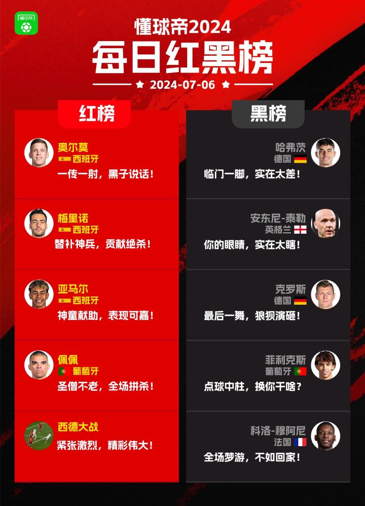 懂球帝每日红黑榜:西班牙三将入红榜,黑榜竟有盲人出现?我上榜啦 @懂球帝2024-07-06 08:00大家早安,懂球帝红黑榜继续早八与您相见!收获绝杀惊险晋级半决赛的西班牙,红榜三人入选。紧张刺激的西德大战,是否将你的肾上腺素飙到最高?老兵不死,41岁老将佩佩凭借全场精彩的防守表现,再度荣膺红榜!黑榜这边,“盲人裁判”安东尼-泰勒领衔出镜,跟随东道主出局的哈弗茨、克罗斯上榜,踢丢点球的菲利克斯和全场梦游的穆阿尼也紧随其后,展开更多