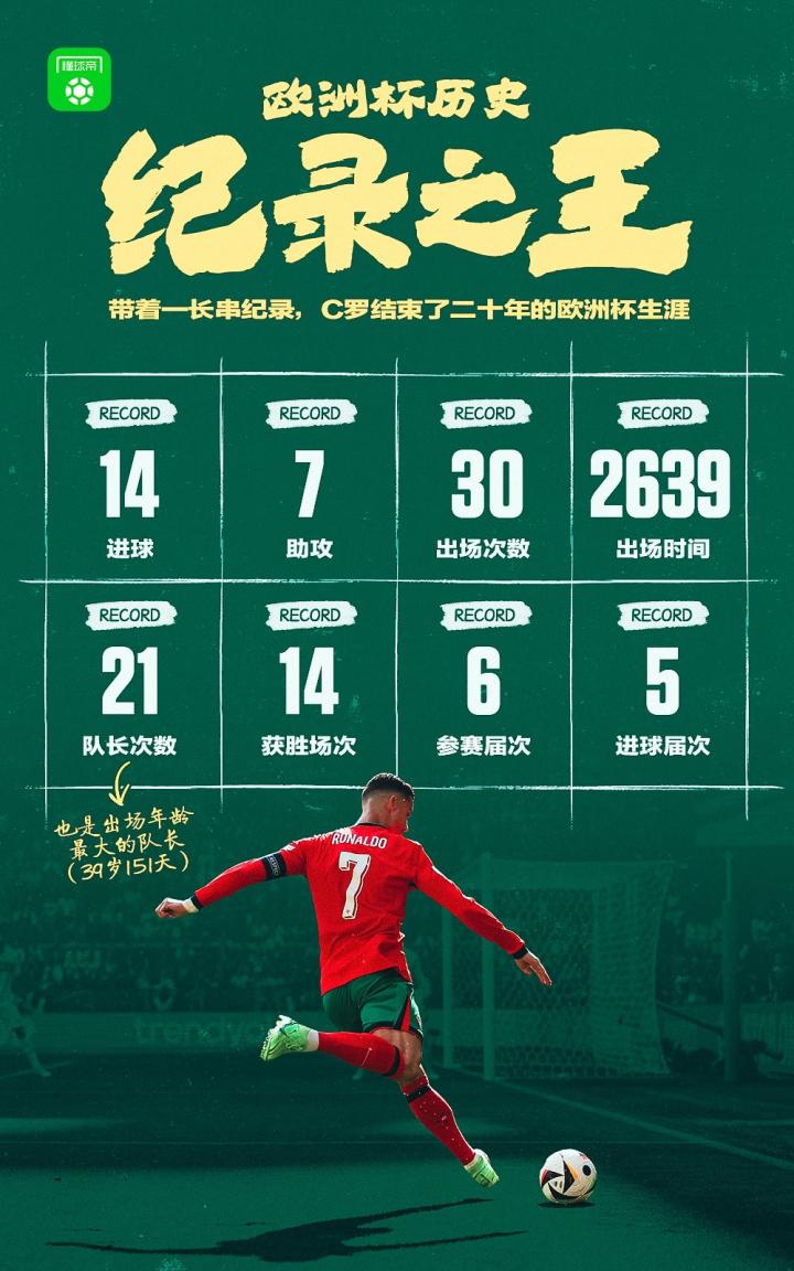 从2004年,到2024年,历经二十年,C罗成为了欧洲杯的纪录之王,由他保持的欧洲杯纪录也定格在此。