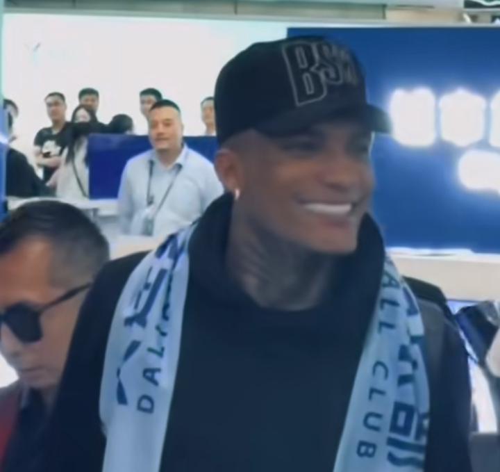 抵达大连周水子国际机场后,卡兰加受到大连英博球迷的热情欢迎,他也披上了大连英博队的围巾。