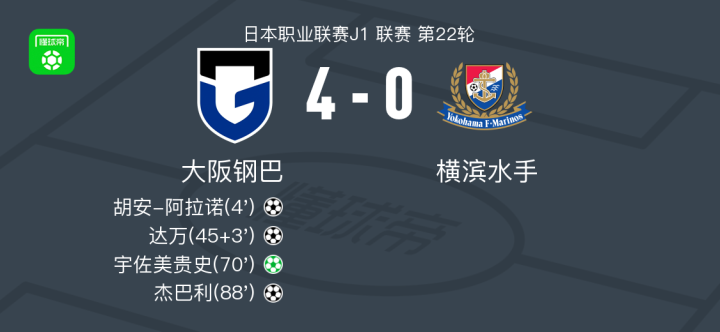大阪钢巴4-0大胜横滨水手,宇佐美贵史1传1射,杰巴利建功
