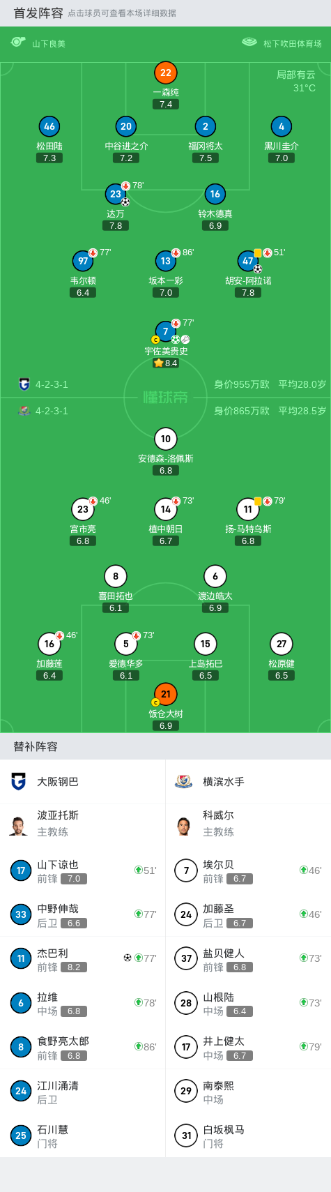 北京时间7月6日,日本职业联赛J1联赛第22轮,大阪钢巴主场迎战横滨水手。比赛中,大阪钢巴的胡安-阿拉诺率先破门,随后宇佐美贵史助攻达万再下一城。接着,宇佐美贵史通过点球扩大比分。比赛接近尾声时,山下谅也助攻杰巴利锁定胜局。最终,大阪钢巴以4-0完胜横滨水手。