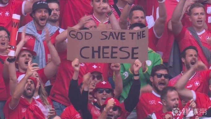 现场的照片看到,有瑞士球迷举起了“天佑芝士(God save the cheese)”的牌子——源自英国国歌《天佑国王(God save the king)》,但是把“国王”改成了“芝士”。