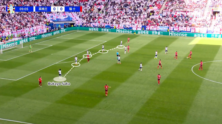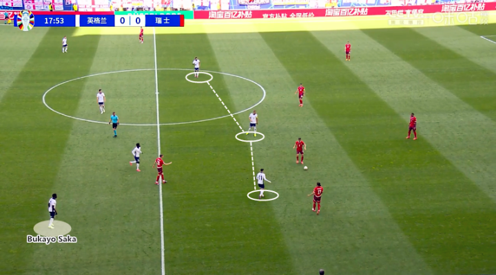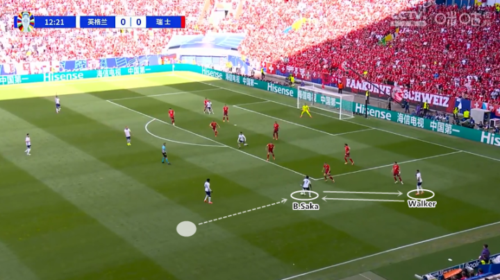 萨卡在进攻端大包大揽,参与防守时也很卖力。英格兰的五后卫防线压缩了巴尔加斯和恩多耶在肋部的活动空间,沃克作为边中卫可以很好地应付速度型前锋,瑞士的进攻遇到了很大阻力。不同于被动变阵的英格兰,瑞士的三中卫阵型磨合了很长时间,临场应变和调整能力显然更为出色。当他们发现打纵深效果不佳时,便开始利用横向的拉扯去制造空间,英格兰对这种变化准备不足。