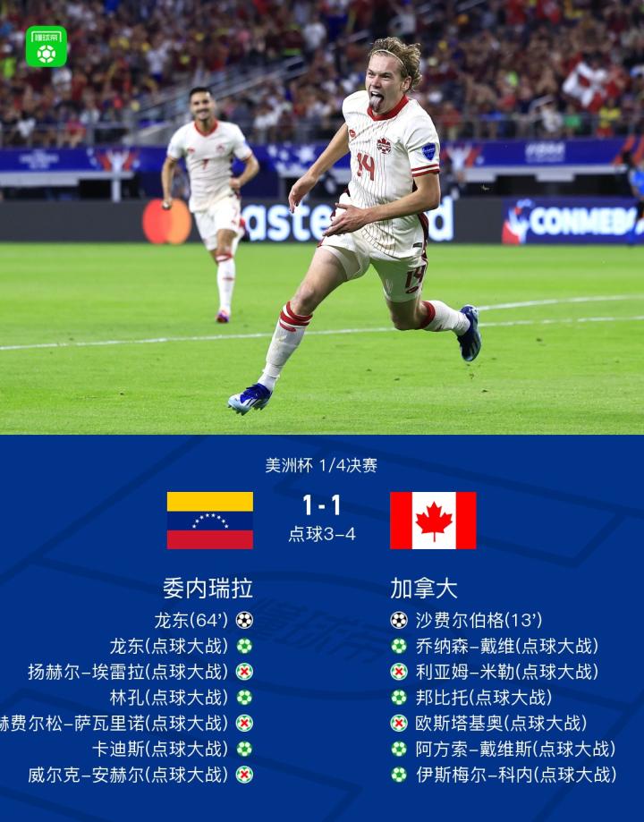 美洲杯1/4决赛,加拿大对阵委内瑞拉,双方在常规时间战成1-1,最终加拿大在点球大战中赢球晋级美洲杯4强,四强对手是阿根廷。
