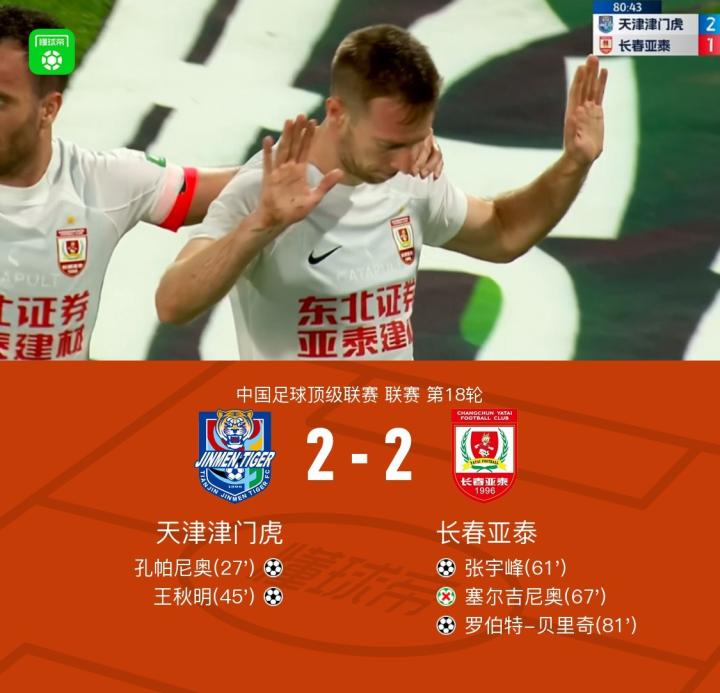 【津门虎2-2亚泰,阿代米两助攻,孔帕尼奥建功,贝里奇扳平】