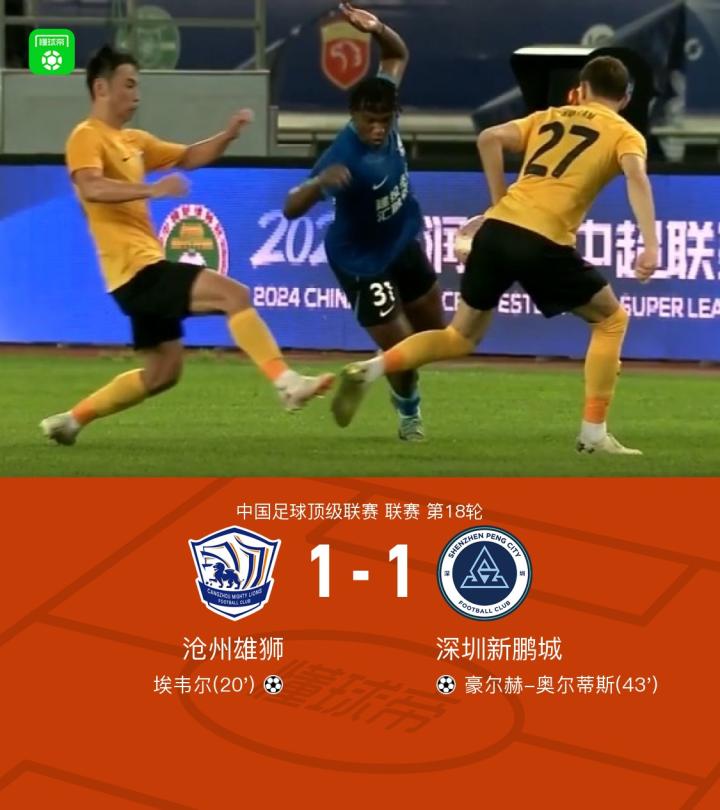 【沧州1-1新鹏城,胡睿宝回传失误送埃韦尔破门,奥尔蒂斯扳平】
