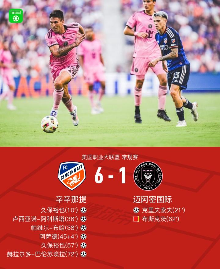 北京时间7月7日,美国职业大联盟常规赛,辛辛那提主场迎战迈阿密国际。上半场,久保裕也打破僵局,克里夫索夫扳平比分,阿科斯塔、布哈两分钟连入两球,阿萨德补时破门。下半场,久保裕也再下一城,布斯克茨犯规后抱怨裁判连续染黄被罚下,巴伦苏埃拉低射建功,最终,迈阿密国际1-6辛辛那提跌至积分榜第二,辛辛那提升至榜首。
