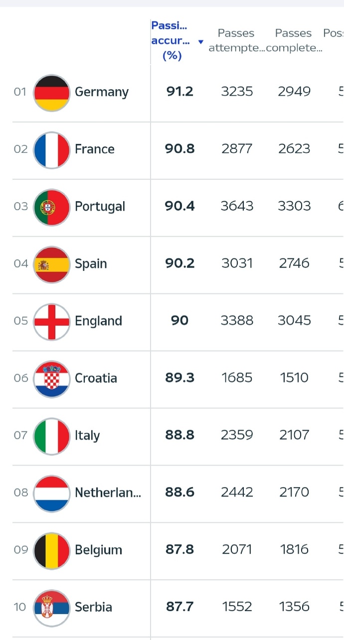 2024欧洲杯1/4决赛已全部结束,四强队伍诞生...咪咕体育 @懂球帝2024-07-07 16:292024欧洲杯1/4决赛已全部结束,四强队伍诞生。欧足联官方公布了本届参赛球队的传球成功率并进行了排名。 德国:91.2% 法国:90.8% 葡萄牙:90.4% 西班牙:90.2% 英格兰:90% 克罗地亚:89.3% 意大利:88.8% 荷兰:88.6% 比利时:87.8% 塞尔维亚:87.7%展开更多