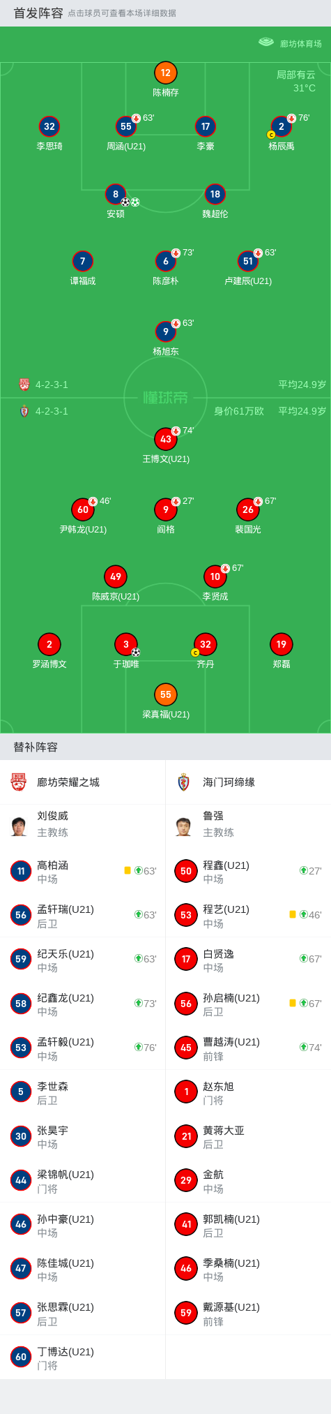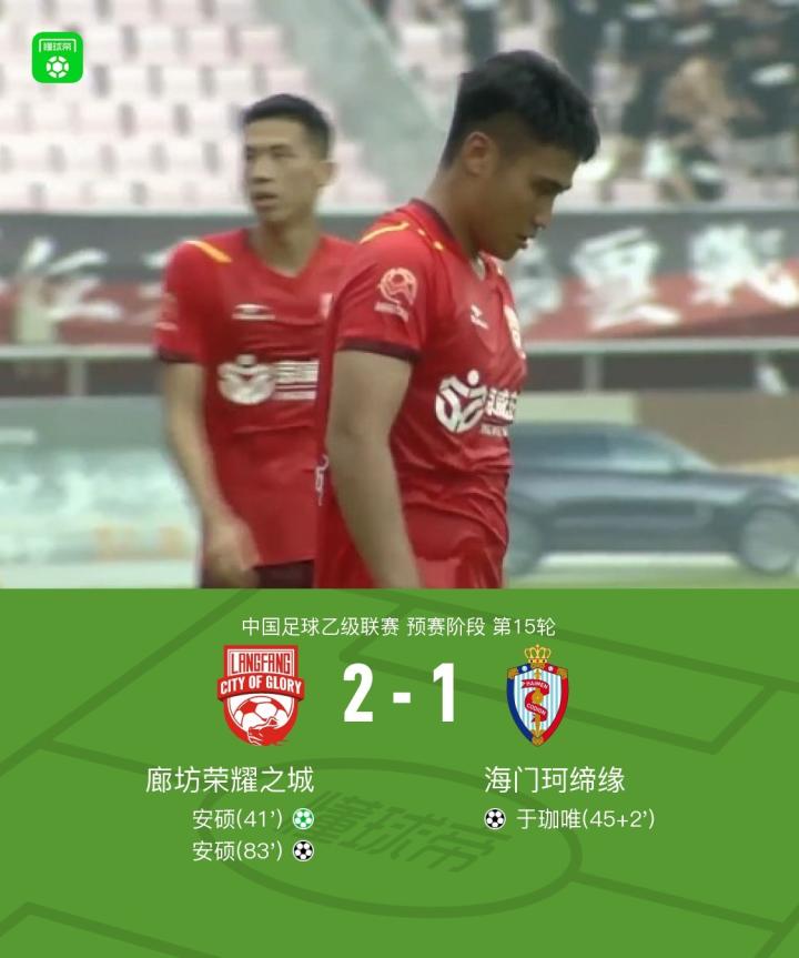 北京时间7月7日,中国足球乙级联赛预赛阶段第15轮,廊坊荣耀之城主场迎战海门珂缔缘。比赛中,廊坊荣耀之城的安硕表现出色,成功梅开二度。而海门珂缔缘的于珈唯也不甘示弱,打入一球。最终,廊坊荣耀之城以2-1战胜海门珂缔缘。