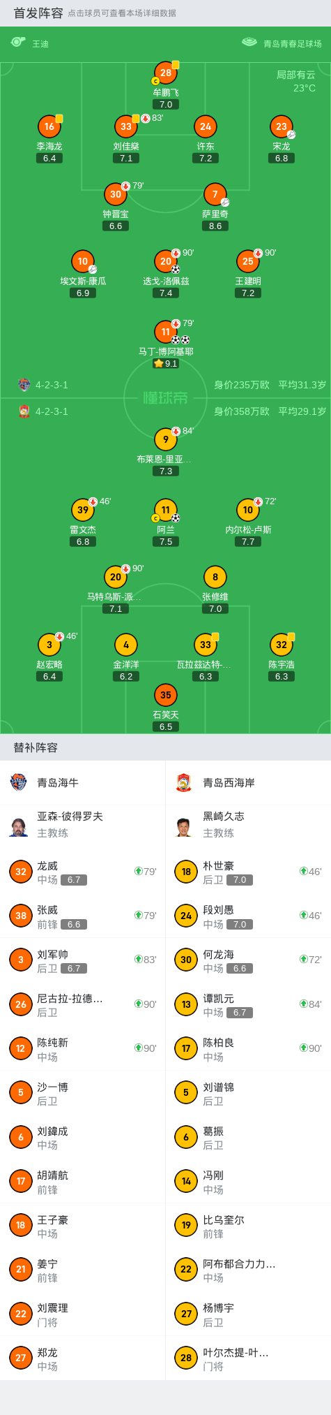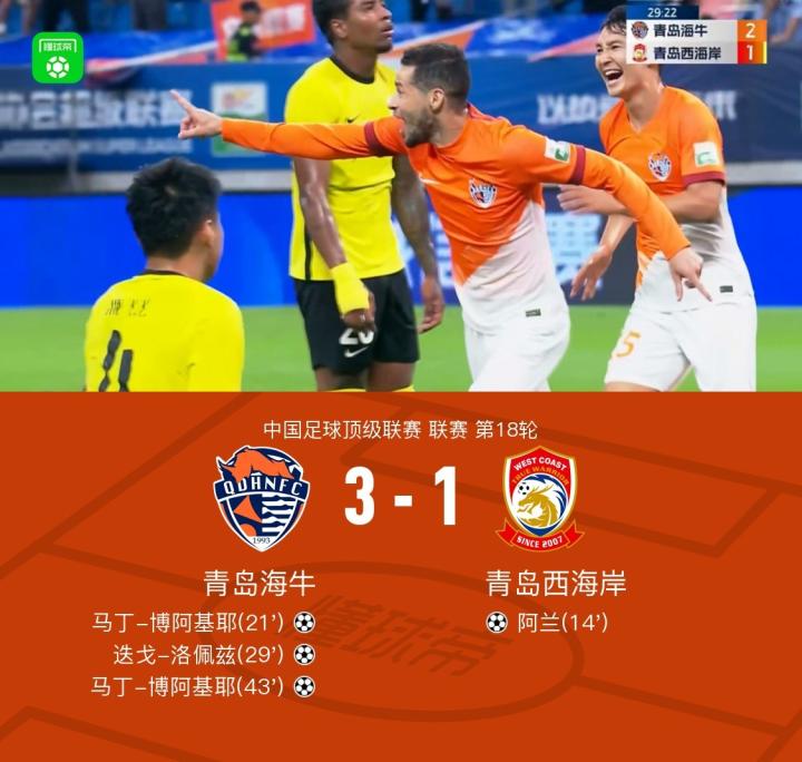 北京时间7月7日,中国足球顶级联赛第18轮,青岛海牛主场迎战青岛西海岸。上半场比赛中,阿兰世界波率先破门,随后博阿基耶梅开二度,迭戈-洛佩兹取得进球;下半场,双方均无建树,最终,青岛海牛以3-1战胜青岛西海岸,送西海岸七轮不胜。