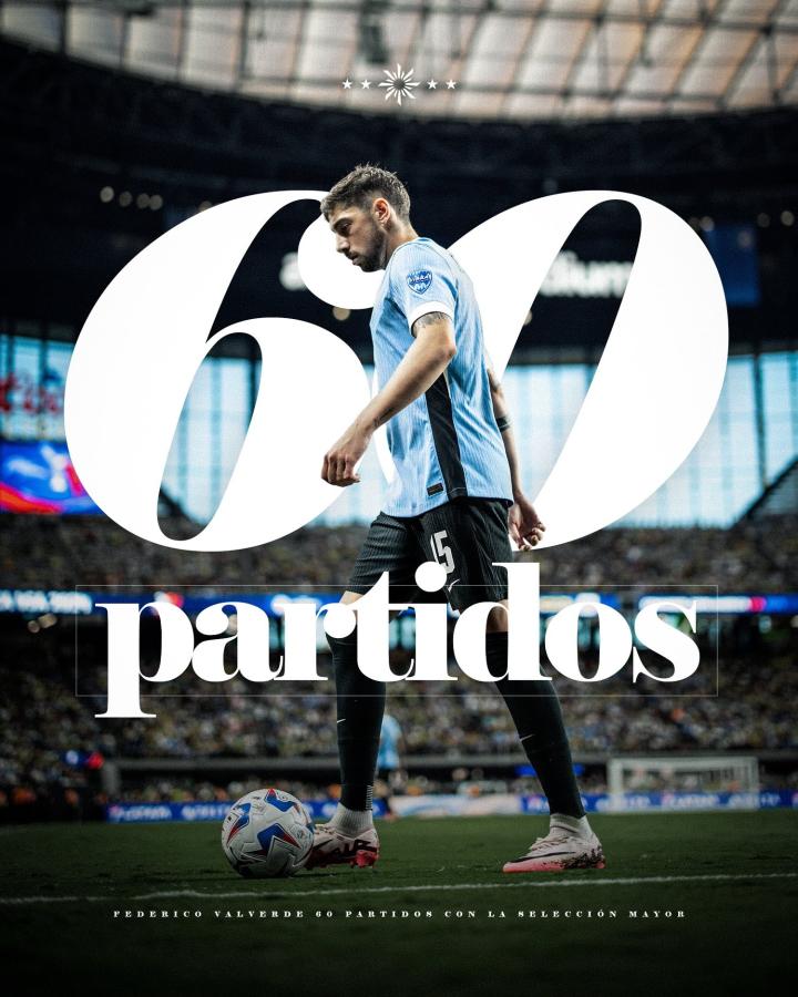 费德里科-巴尔韦德达成国家队生涯60场里程碑,乌拉圭国家队官方发布海报送祝贺。