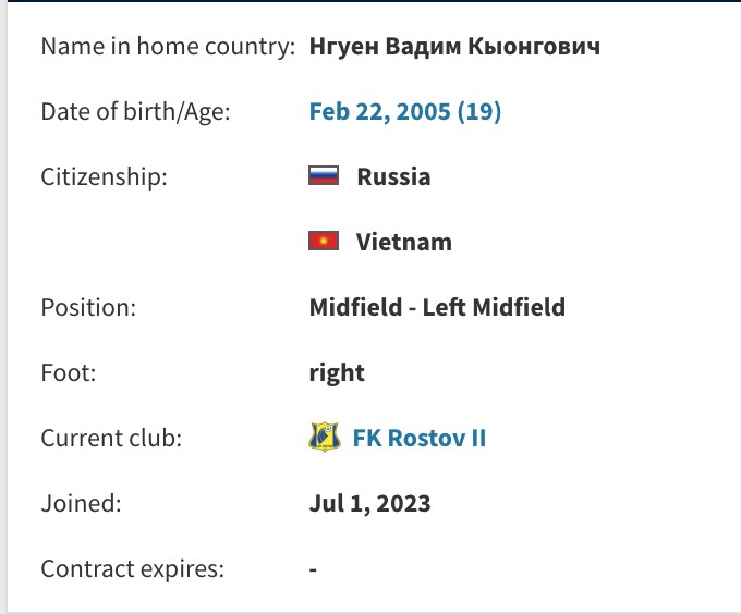 目前,这位19岁的混血球员效力于俄罗斯超级联赛罗斯托夫俱乐部二队。近日,瓦迪姆-阮也与该队签订了职业合同。瓦迪姆-阮在俄罗斯青年锦标赛上总共参加了53场比赛,打进4球。