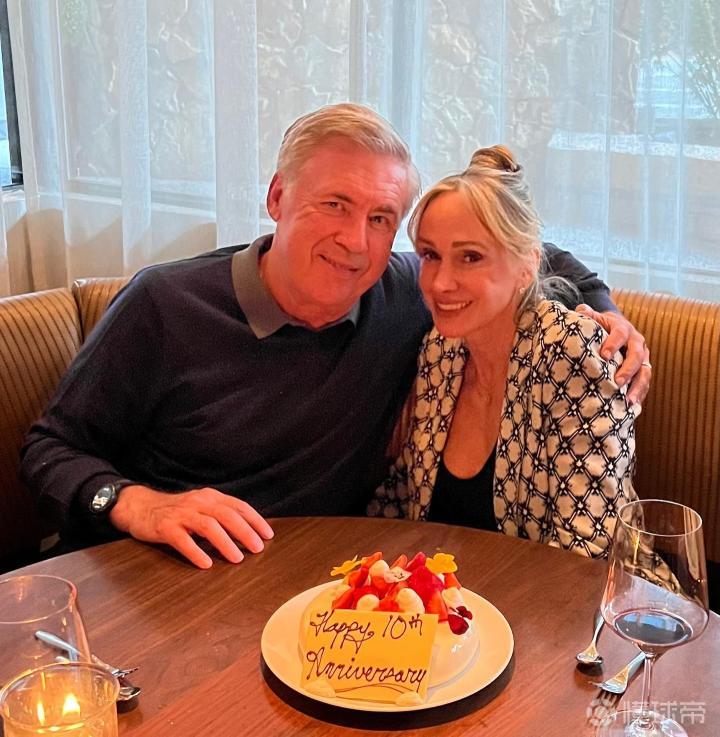 今日,安切洛蒂晒出他和妻子在温哥华度假的合照,桌上放着庆祝10周年纪念日的蛋糕,安帅写道:“在我们最喜欢的地方之一庆祝属于我们的一天。”