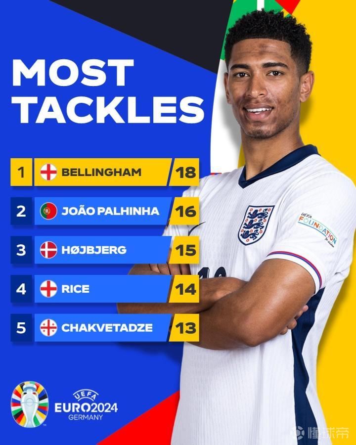 2024年欧洲杯只剩最后三场比赛,欧洲杯官方公布了本届赛事至今球员抢断次数排行,英格兰中场贝林厄姆以18次位列第一,葡萄牙中场帕利尼亚以16次排名第二,另外一位英格兰球员赖斯则以14次位列第四。