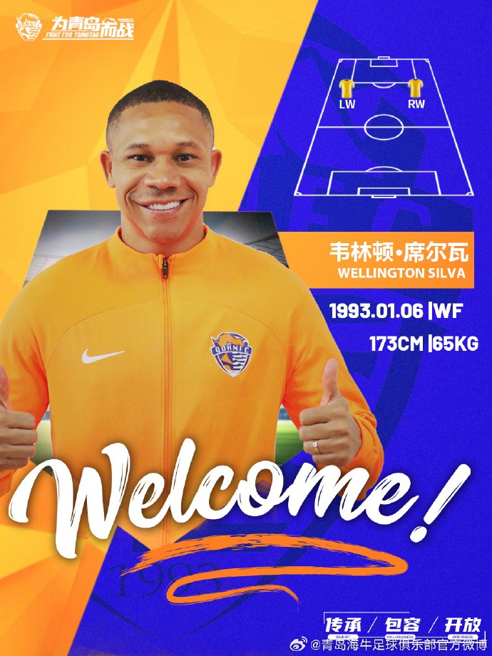 巴西籍球员韦林顿-席尔瓦(Wellington Alves da Silva)自即日起正式成为青岛海牛足球俱乐部一员,他将身披37号球衣为球队而战,欢迎他的到来。