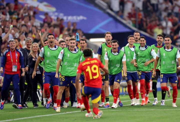 打进这一粒精彩绝伦的进球后,亚马尔冲向场边庆祝,随即就被替补席上的西班牙队友们团团包围,这一组照片也马上在网络上得到了球迷们的疯转。