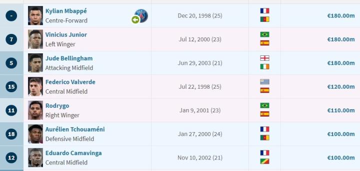 据德转最新身价统计,皇马队中目前拥有7名身价过亿的球员,但目前只有贝林厄姆和巴尔韦德仍在征战欧洲杯和美洲杯。