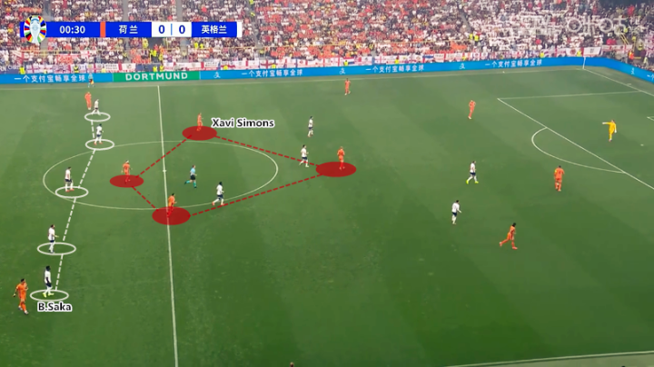 (图)同对阵瑞士时相比,英格兰球员的场上站位没有变化,萨卡的角色依然是边翼卫。科曼调整了荷兰球员的站位,目的就是建立中场人数优势,对梅努和赖斯形成夹击,哈维-西蒙斯的进球是高位逼抢的产物。