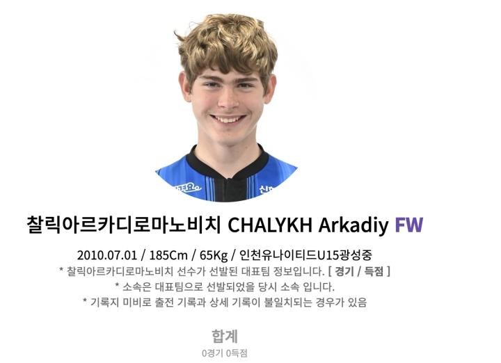 日前,韩国足协官网公布了最新一期韩国U14国家队大名单,其中可以看到,一位名叫查利克-阿尔卡迪-罗马诺维奇(Chalykh Arkadiy)的球员也入选了大名单。据悉,该球员也是韩国U系列各级青年队历史上首度出现归化球员。