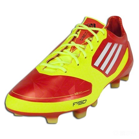 不过在2010年以前,作为传统足球大牌的Adidas,还一直坚持着经典触感全面型足球鞋的塑造,因此早年的F50足球鞋的重量一直是一大硬伤,并不能划分为绝对的速度系球鞋。然而随着Nike刺客系列的持续高光表现所带来的超高销量,Adidas终于痛定思痛,将足球鞋的“轻量化”和“速度化”正式提上了日程!Adidas F50 Adizero足球鞋就此应运而生!全新的Adidas F50足球鞋正式发布于2010年,虽然名字依旧叫做F50系列足球鞋,但是在尾缀上加上了“Adizero”的字样,意在表达全新的F50系列在重量上的一次轻质革命!相比前代Tunit的可拆装的噱头,但是依旧没有摆脱传统系足球鞋重量偏重的束缚,真正轻质的速度系概念显然更加能迎合市场发展的大众口味需求。