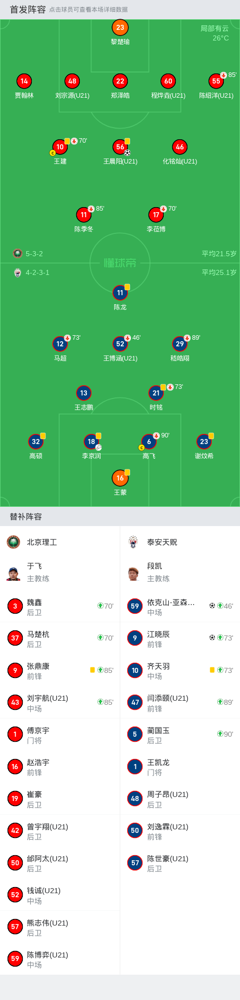 北京时间7月13日,中国足球乙级联赛预赛阶段第16轮,北京理工主场迎战泰安天贶。上半场双方互交白卷,场上局面主队稍占上风。下半场,依克山-亚森江破门,率先打破场上僵局,王晨阳任意球直接破门将比分扳平。齐天羽任意球开到禁区,江晓辰头球破将比分超出。最终泰安天贶客场2-1战胜北京理工。