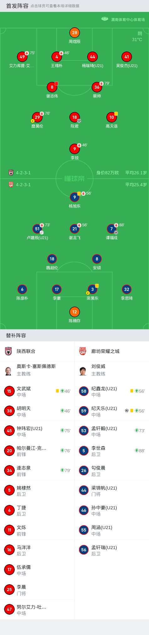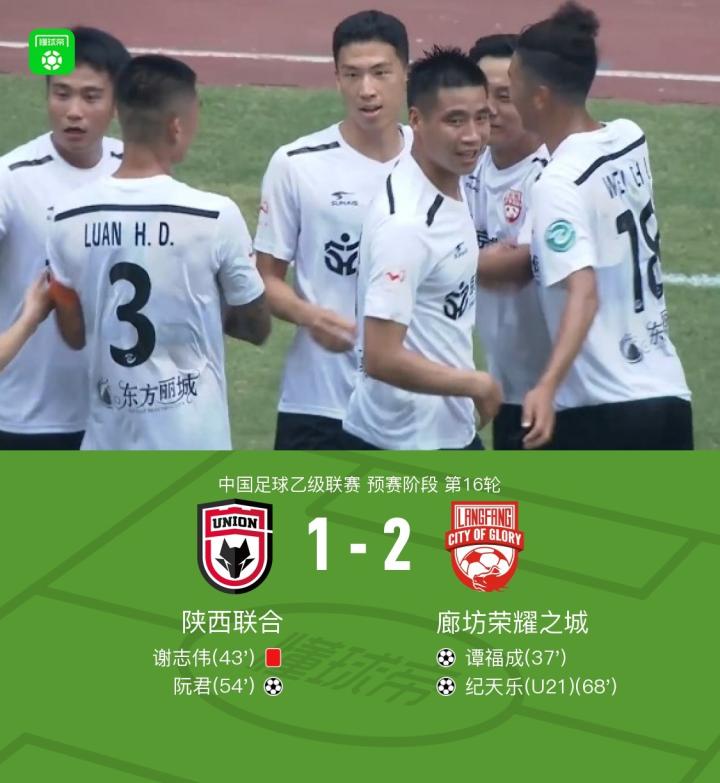 北京时间7月13日17:00,中乙预赛阶段第16轮展开争夺,陕西联合坐镇主场渭南市体育中心体育场迎战廊坊荣耀之城,本场主裁判为王敏杰。上半场,谭福成乱战破门,谢志伟飞踹被直红罚下。下半场,阮君补射扳平比分,纪天乐打入制胜球。最终,廊坊荣耀之城2-1双杀陕西联合。