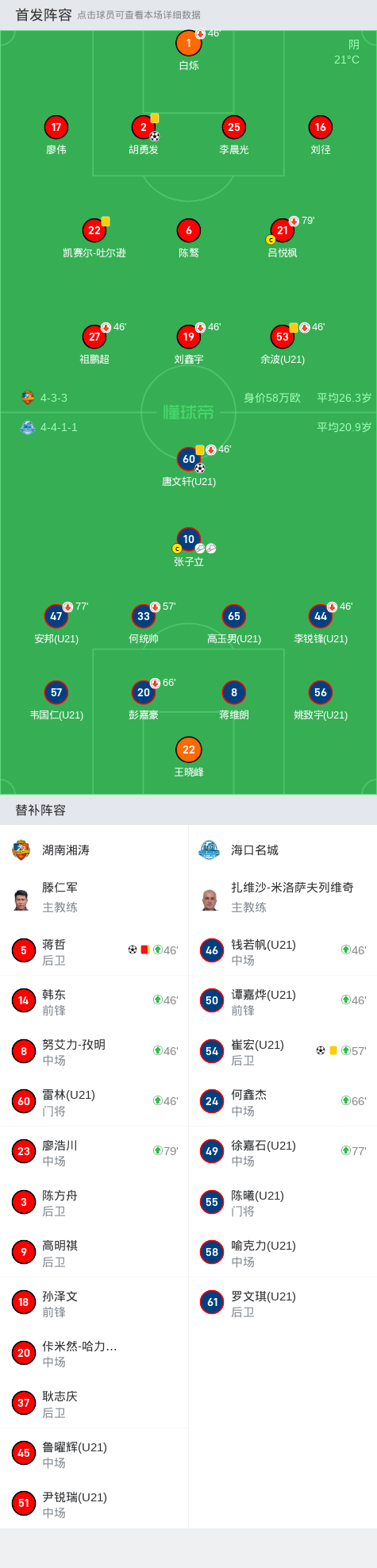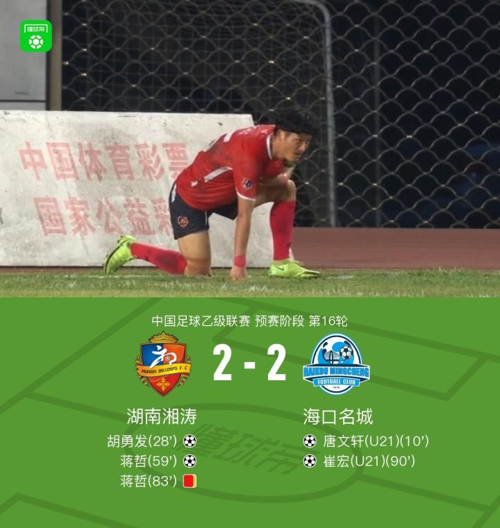 湖南湘涛2-2海口名城,张子立两助攻,崔宏绝平比分