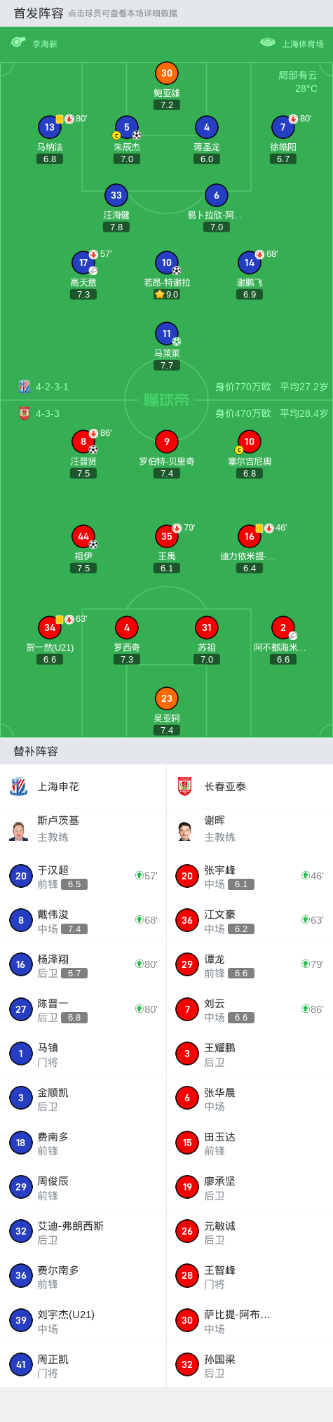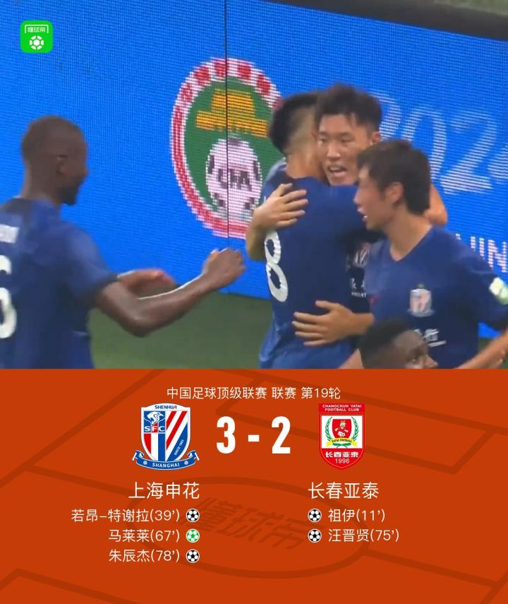 北京时间7月13日晚间20:00,中超联赛第19轮,上海申花坐镇主场上海体育场,迎战长春亚泰,本场比赛主裁判为李海新,VAR视频助理裁判为邢琦。上半场,蒋圣龙失误被断,祖伊率先破门,谢鹏飞射门造险,特谢拉扳平比分。下半场,替补登场的于汉超推射中柱,阿马杜造点,马莱莱点射反超比分,随后汪晋贤兜射扳平比分,两分钟后,朱辰杰头球破门,补时阶段,马莱莱分别错失单刀和射门中楣。 最终,上海申花3-2长春亚泰。