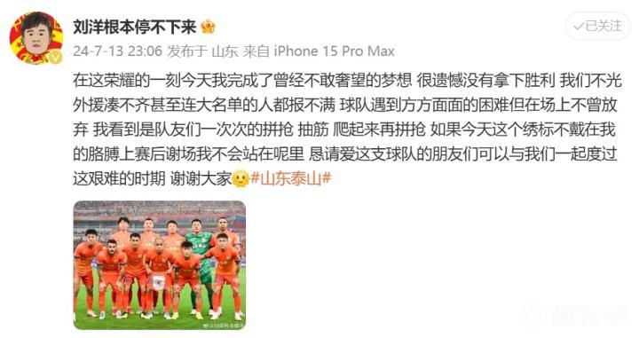 北京时间7月13日晚,中超第19轮,山东泰山在主场1-1战平青岛海牛。赛后,刘洋在微博发文谈到了球队当前的情况。