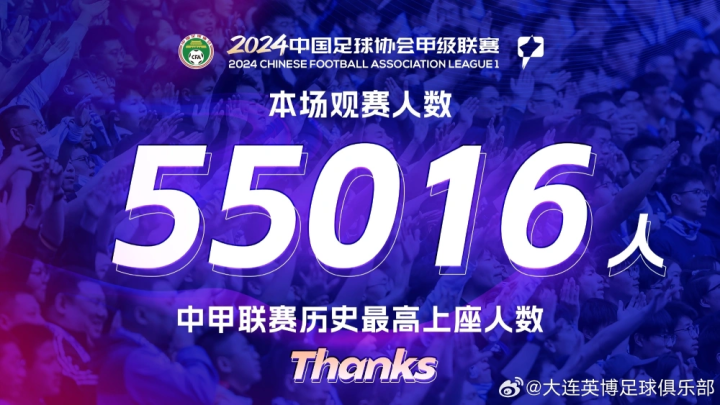 FIFA主机专栏7月13日晚,再大连英博主场迎战苏州东吴的中甲第17轮比赛中,55016名观众来到梭鱼湾足球场现场观赛,创造了中甲联赛历史最高上座人数。