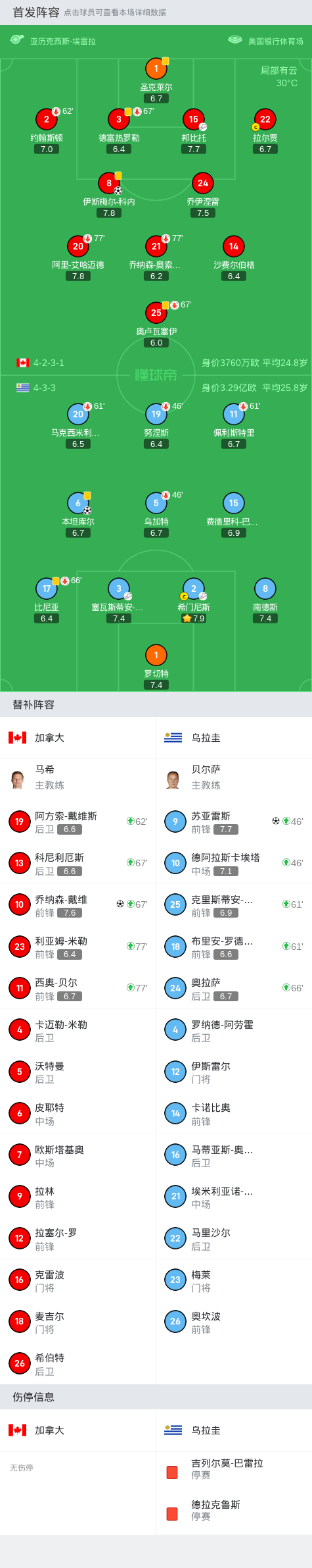 第80分钟,乔纳森-戴维替补出场补射破门,加拿大2-1领先乌拉圭