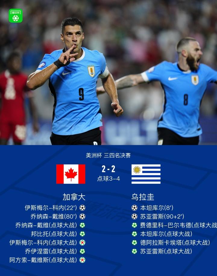北京时间7月14日8:00,美洲杯三四名决赛,加拿大对阵乌拉圭。本坦库尔禁区内转身抽射破门先拔头筹,科内绝妙勾射扳平比分,佩利斯特里进球被吹无效,半场尾声阶段,南德斯门线前解围力保城池;下半场巴尔韦德劲射击中门框,乔纳森-戴维补射破门反超比分,尾声阶段苏亚雷斯先错失良机,随后包抄破门绝平比分,将比赛拖入点球大战。点球大战中加拿大队先主罚,科内和阿方索先后罚丢,乌拉圭全部命中。 最终,乌拉圭总比分6-5险胜加拿大,获得了2024年美洲杯的季军。